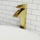 - Contemporary Elegance: Sleek, curved matte brushed gold faucet with tall profile and graceful arc, blending modern sophistication with timeless charm to create a luxurious focal point in your bathroom